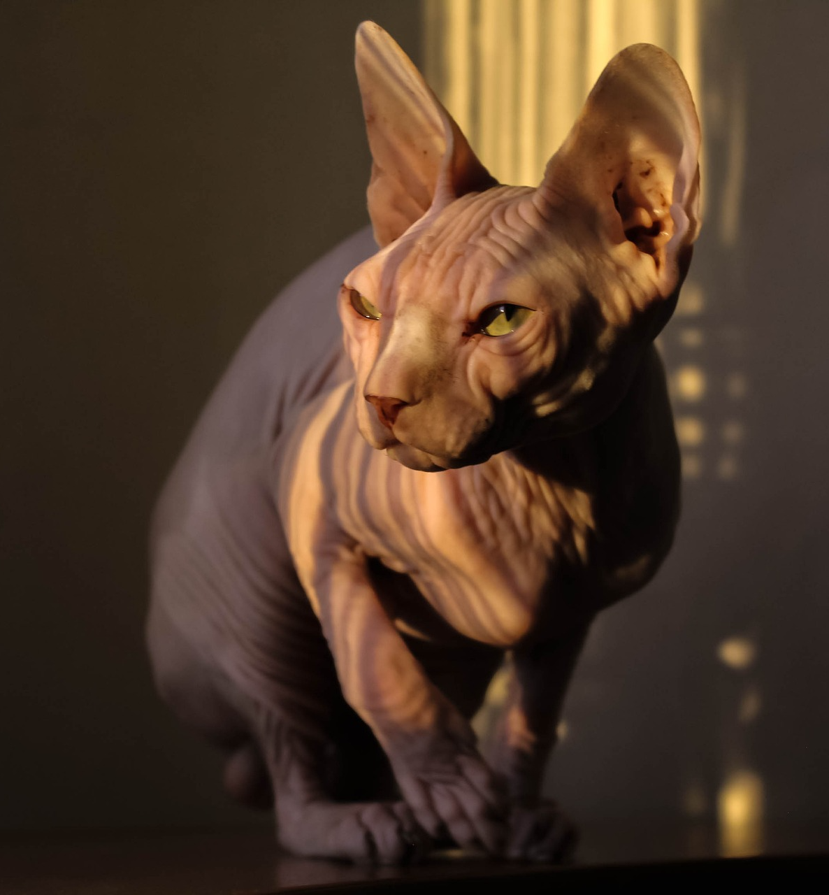 털 없는 고양이로 알려진 스핑크스에 대해 알아보겠습니다. 보통 스핑크스라는 이름을 들으면 피라미드나 파라오처럼 고대 이집트를 연상하게 합니다. 그래서 오래된 기원을 자랑하는 이집트 품종으로 오해하기 쉽지만 사실 1960년대 캐나다에서 자연발생한 돌연변이 개체로부터 시작된 역사가 그리 오래되지 않은 품종입니다. 대신 이집트 벽화에 나온 길쭉하고 맨들해보이는 고양이와 비슷한 모습이라 '스핑크스캣'이라 불렸고 정식 이름이 되었습니다. 크게 캐나다가 기원인 캐네디언 스핑크스와 러시아, 유럽이 고향인 돈스코이 스핑크스로 분류되지만 육안으로 이렇다 할 차이점은 없습니다. 1966년 캐나다에서 발생한 돌연변이 개체의 연구에 의해 교배되어 전파되기 시작했지만 앞서 1900년대 초 멕시코에도 털 없는 고양이가 발견되었다는 기록이 있어 짐작해 보면 북미에서 시작되었다고 할 수 있습니다.