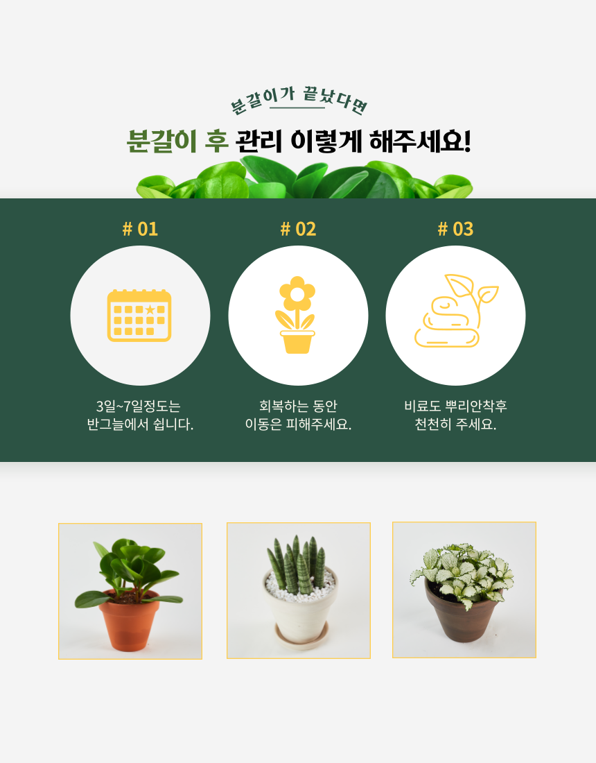 분갈이가 끝났다면 식물도 뿌리를 회복하고 안정화되는 시간을 갖습니다. 사람들도 이사 한번 하고 나면 쉬는 시간도 필요하고 적응하는 시간도 필요하듯 식물도 마찬가지입니다. 직사광선이나 세찬 바람은 피해 주시고 반그늘에서 일주일정도 쉴 수 있도록 해주시는 것이 좋습니다. 식물을 빛이나 바람따라 야외로 자리를 옮겨주시는 경우도 있는데 당분간은 이동하지 않는것이 좋습니다. 뿌리가 회복하고 적응하는 동안은 그래도 두시고 비료도 안착후 천천히 조금씩 주시는것이 좋습니다.