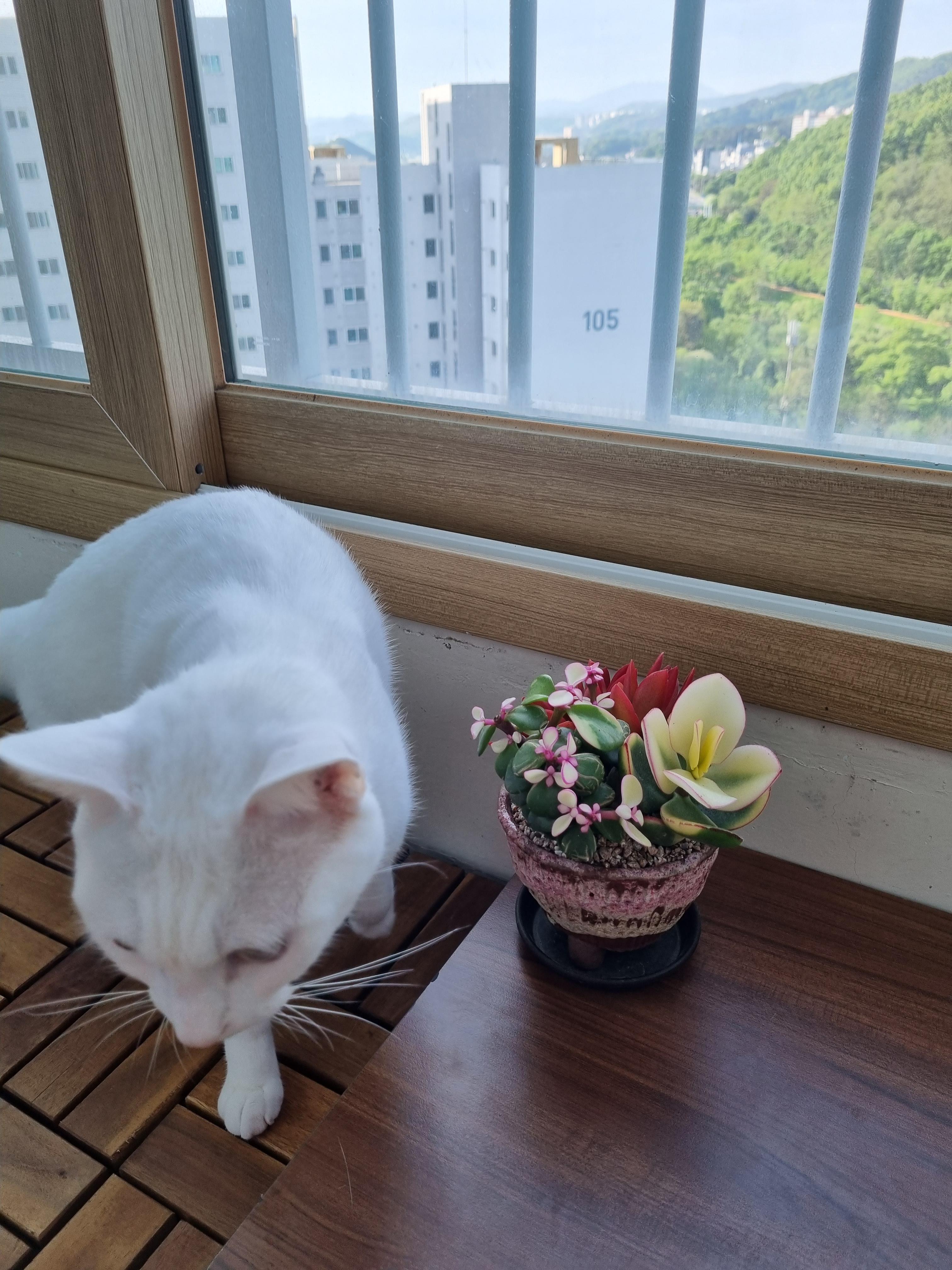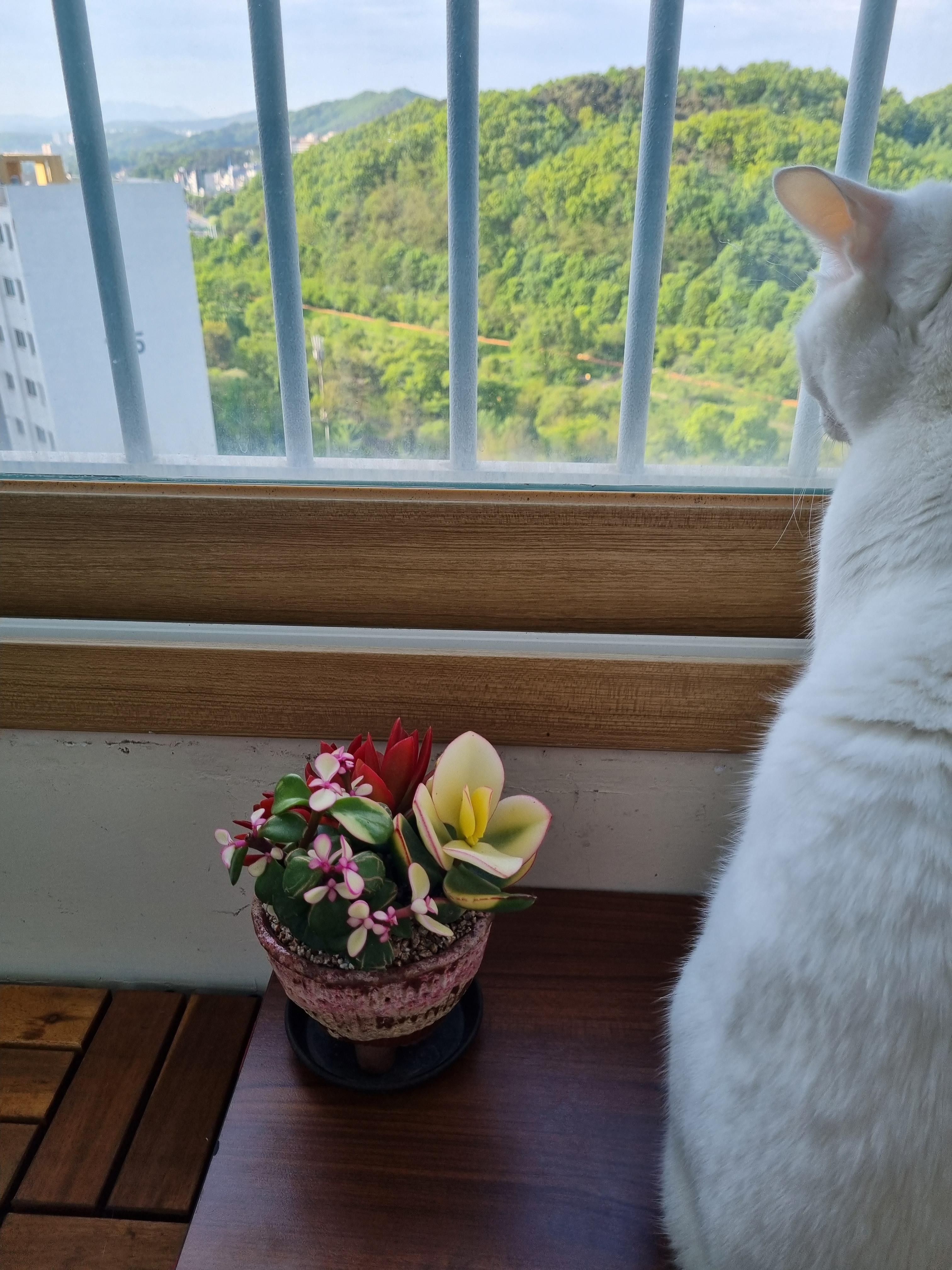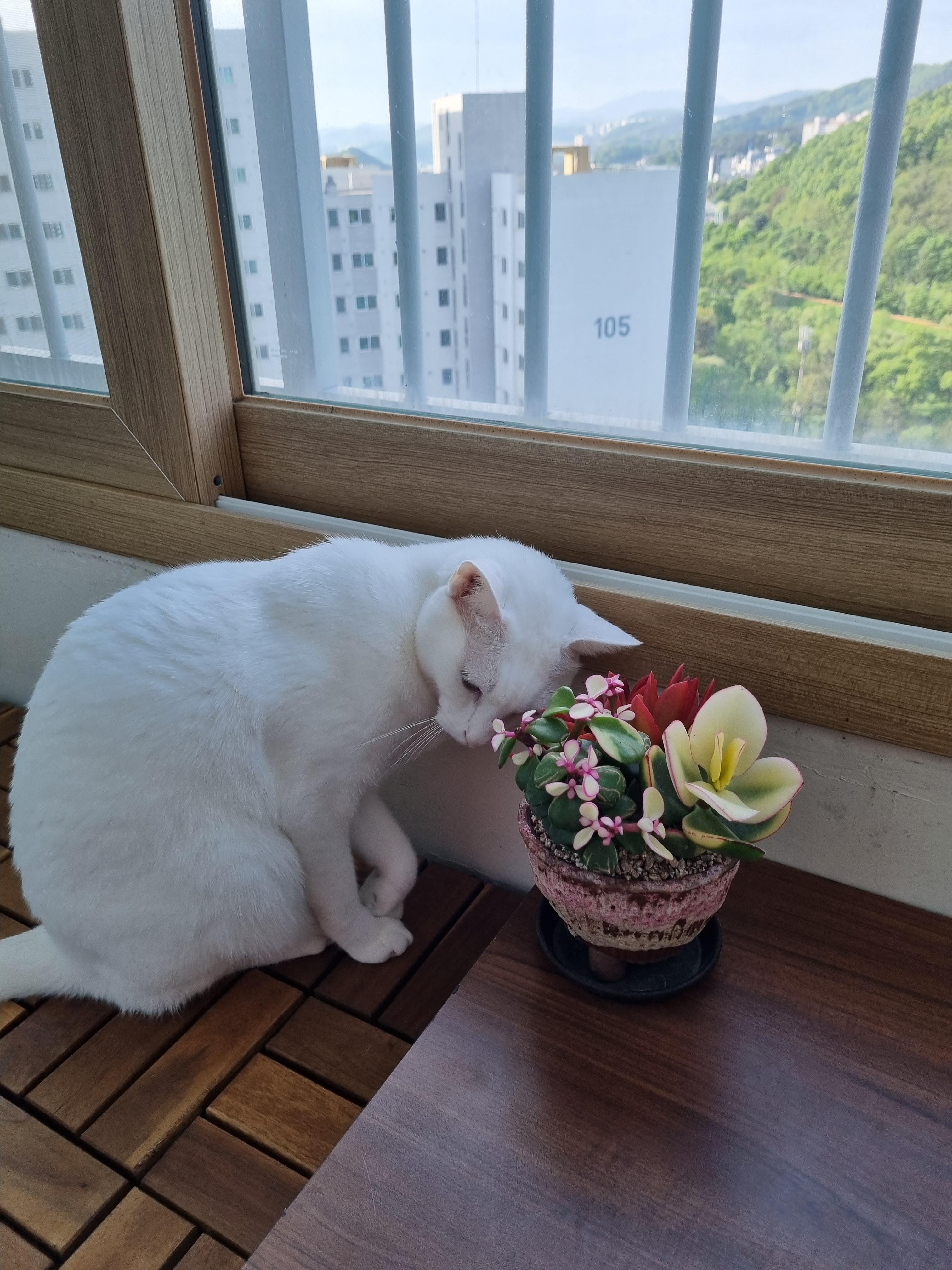 우리 집 망고도 화분을 보자마자 좋다고 부비며 얼쩡얼쩡 사진 속에 들어와 앉았습니다.