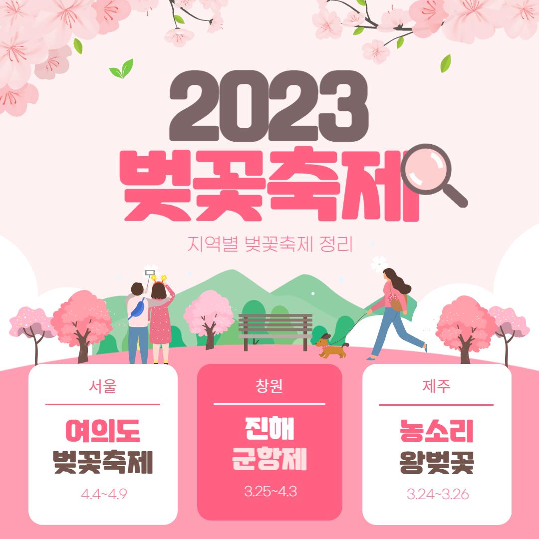 지역 곳곳에 숨은 벚꽃명소들이 많으니 개화시기를 기억해 두셨다가 사진 한장 남겨 오는 것도 괜찮을 것 같은데요. 무엇보다 마스크도 해제되고 오랜만에 지역축제들을 기다리셨던 분들을 위해 지역별 벚꽃축제정보도 가져왔습니다. 많은 인파가 몰릴 것 같긴 하지만 이 또한 축제장의 묘미니 안전에 주의하시어 봄을 즐기고 오셨으면 좋겠습니다.