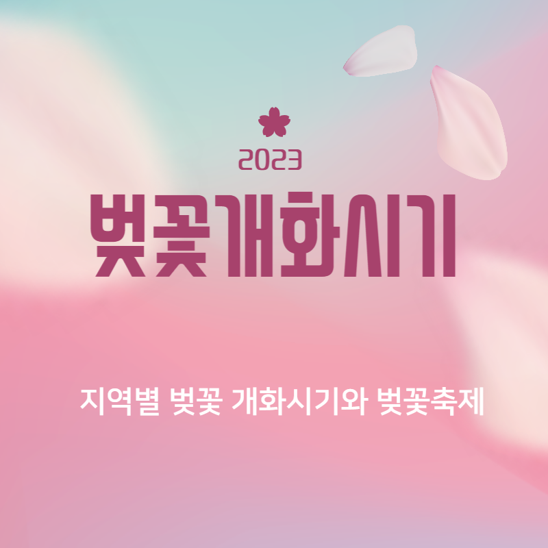 2023년 올해 기상청은 오는 29일 여수 등 남부 지역을 시작으로 벚꽃 개화가 시작할 것으로 예상했고 다음 달 3일이면 서울을 포함한 전국 곳곳에서 봄꽃풍경을 감상할 수 있을것으로 전망했습니다. 올해 봄꽃 개화시기는 평년보다 2~9일 빠르며 벚꽃 개화시기는 제주는 3월 22일, 대구 3월 26일, 광주·포항·부산은 3월 27일, 대전·강릉 3월 31일, 청주 4월 1일, 서울 4월 3일, 춘천·인천은 4월 7일,8일 순서대로 예상됩니다. 만개시기는 개화일로부터 일주일정도 지난 시기로 보시면 됩니다.